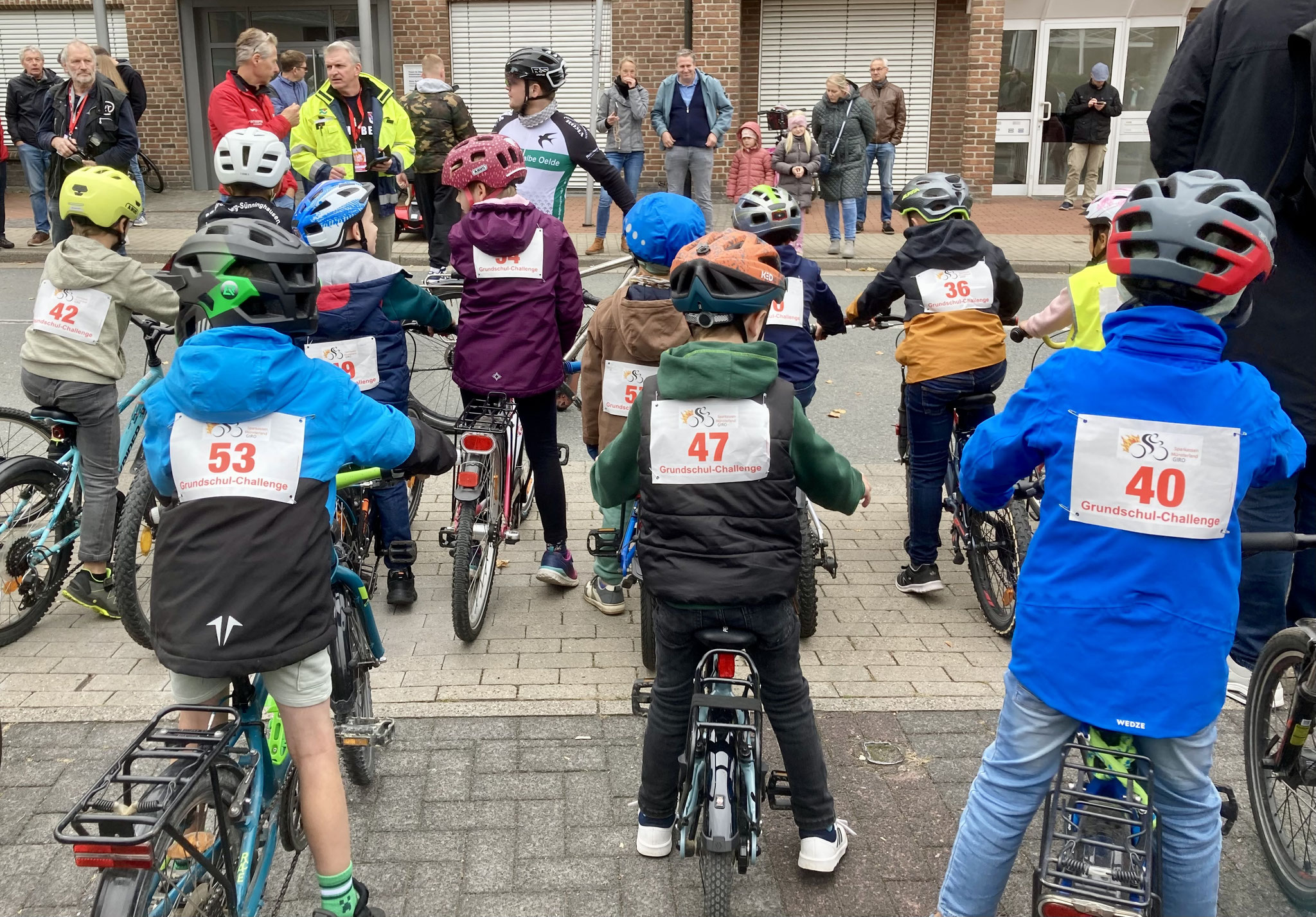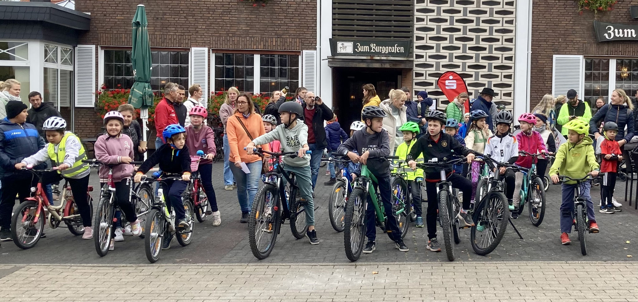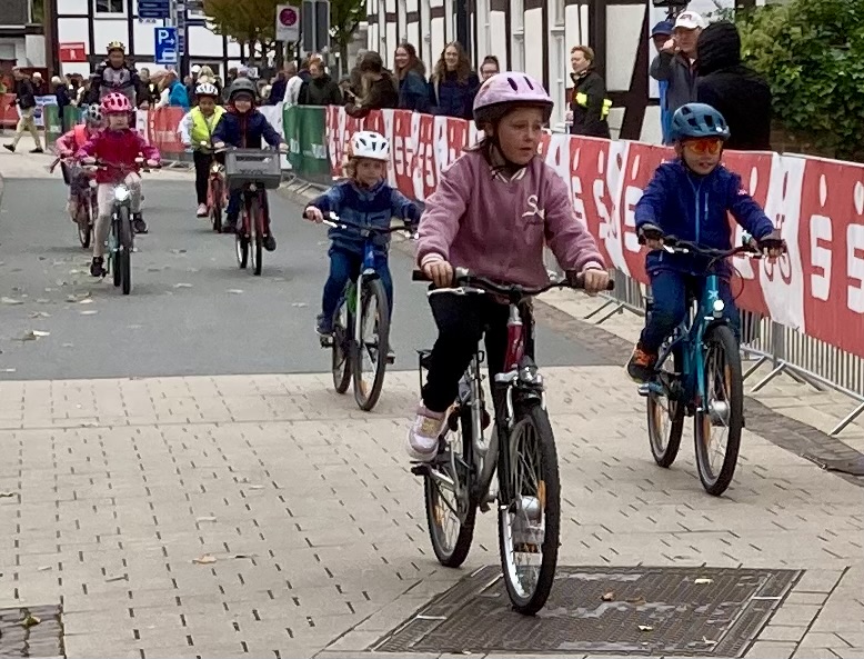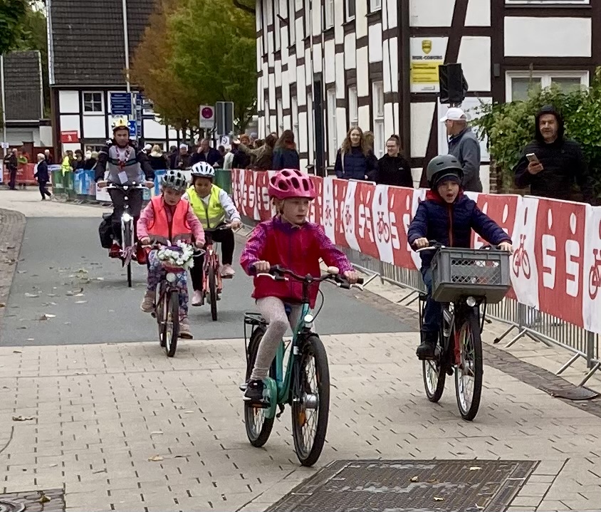 Im Rahmenprogramm des Münsterland-Giro, der in diesem Jahr in Stromberg startete, gab es auch ein Radrennen für Kinder. Bei dieser Grundschul-Challenge durften die Schulkinder über zwei bzw. drei Runden durch den Stromberger Ortskern an den Start gehen. Im Ziel durften sich alle Kinder als Sieger fühlen, dekoriert mit einer funkelnden Medaille. Bei der großen Siegerehrung auf dem Marktplatz wurden nicht nur die Erstplatzierten über Pokale freuen. Auch Schulleiterin Claudia Lutterbeck durfte einen Scheck über 350€ in Empfang nehmen, stellte doch die Lambertus-Schule vor der von-Ketteler-Schule die meisten Teilnehmenden. Das Geld kommt unserem Förderverein zugute.