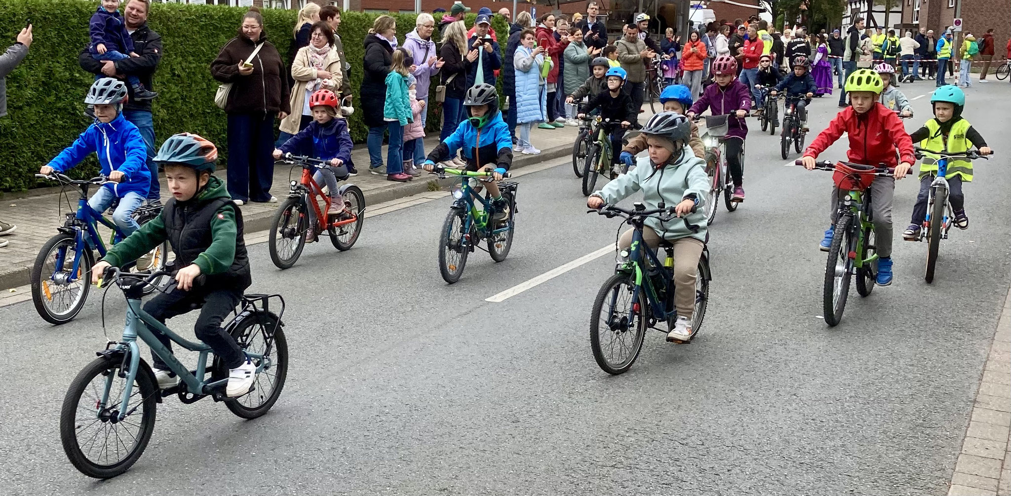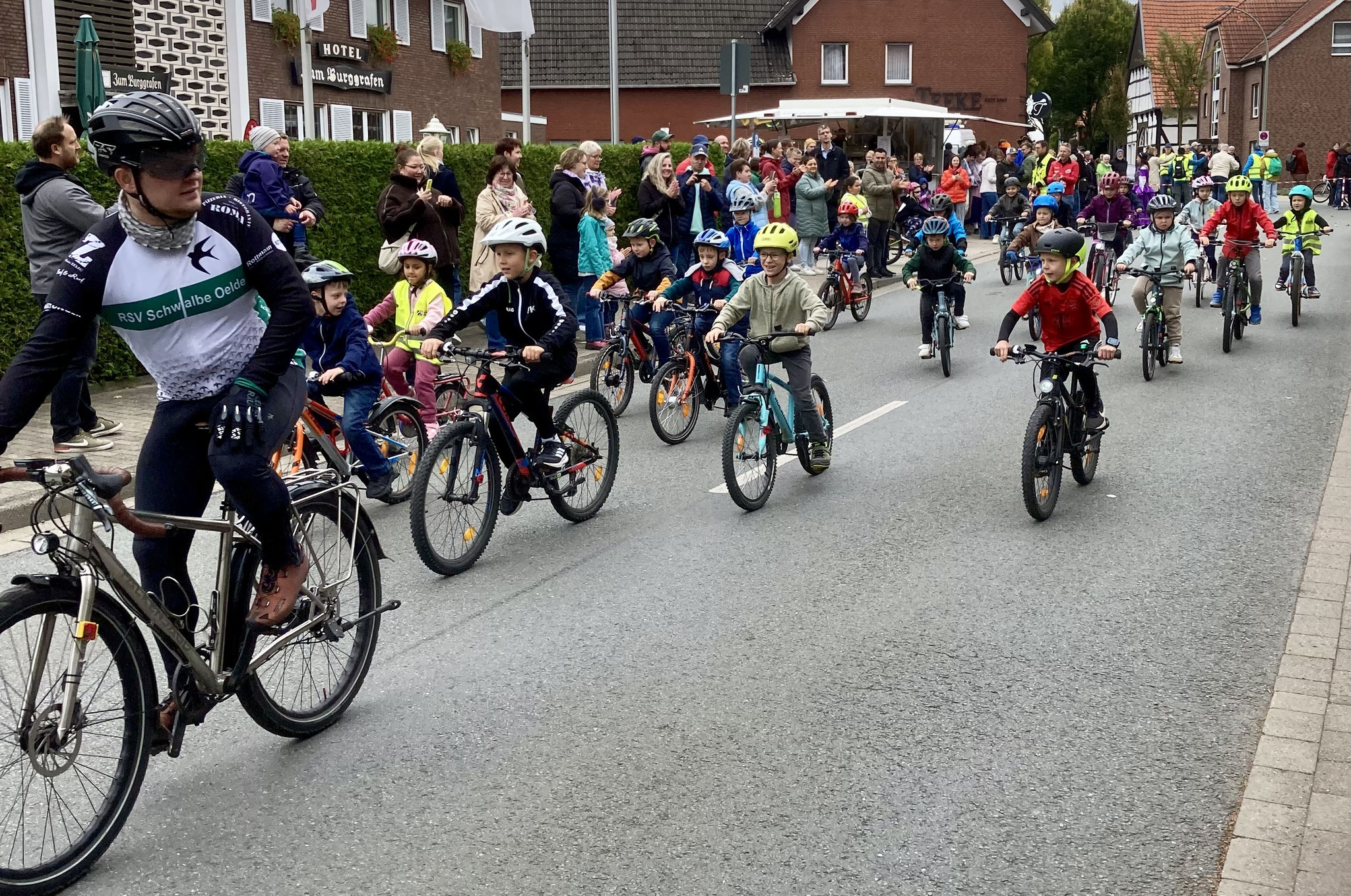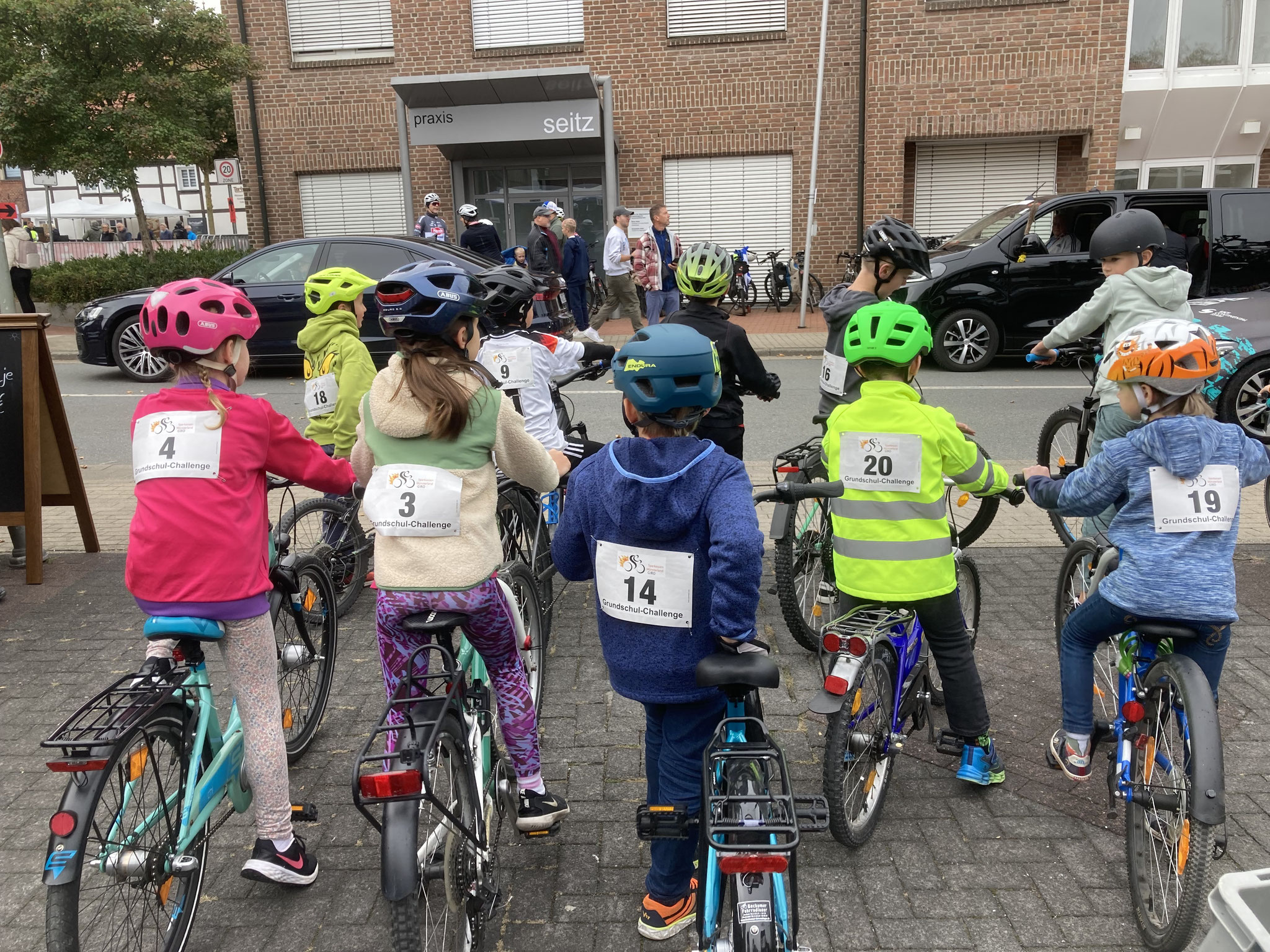Im Rahmenprogramm des Münsterland-Giro, der in diesem Jahr in Stromberg startete, gab es auch ein Radrennen für Kinder. Bei dieser Grundschul-Challenge durften die Schulkinder über zwei bzw. drei Runden durch den Stromberger Ortskern an den Start gehen. Im Ziel durften sich alle Kinder als Sieger fühlen, dekoriert mit einer funkelnden Medaille. Bei der großen Siegerehrung auf dem Marktplatz wurden nicht nur die Erstplatzierten über Pokale freuen. Auch Schulleiterin Claudia Lutterbeck durfte einen Scheck über 350€ in Empfang nehmen, stellte doch die Lambertus-Schule vor der von-Ketteler-Schule die meisten Teilnehmenden. Das Geld kommt unserem Förderverein zugute.