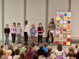 Sehr sportlich zeigte sich Adrian, der bei einem Radrennen in Hamm den 1. Platz belegte und neben einem großen Pokal auch 200€ für den Förderverein der Schule begann. "Das Schülerparlament darf sich überlegen, wofür das Geld verwendet wird", so der Viertklässler. Auch das neue Motto des Monats wurde wieder erklärt und vorgestellt. Dazu hatten Frau Jürgens und Frau Gohr mit den Handpuppen von Zebra Franz und Lubo wieder ein kleines Video gedreht. Musikalisch beendet wurde die Feier mit einem Ständchen für die Geburtstagskinder der vergangenen Wochen sowie schon traditionell mit dem Lambertuslied.