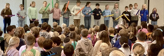 Ein bisschen Show gab es dann doch noch, nämlich beim Monatsabschluss im Lambertushaus, zu dem die großen und kleinen Besucher herzlich eingeladen waren. Hier stand bei mehreren Darbietungen der Herbst im Mittelpunkt: Die Klasse 1c führte ein Bewegungslied vor, die Klasse 2a hatte ein Rhythmical eingeübt und die Klasse 4a begleitete ihr Herbstlied mit Boomwhakern.