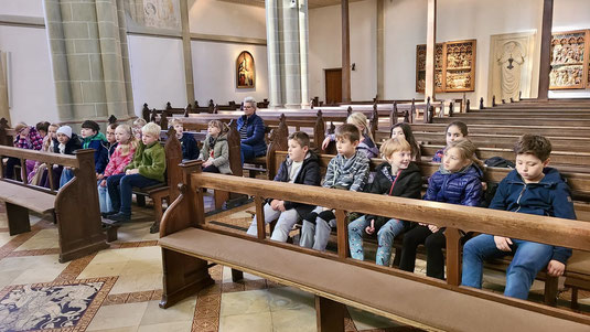 Die Kinder der dritten Klassen nahmen an einer Kirchenführung mit Pastor Ehlert teil. Zunächst konnten die Kinder die besondere Atmosphäre des Kirchenraumes der Heilig-Kreuz-Kirche erfahren und die Kirche mit ihren Augen erforschen. Danach gab Pastor Ehlert den Kindern ausführliche Informationen zur Raumgestaltung, zum Bilder- und Figurenschmuck und zu wichtigen Einrichtungsgegenständen wie Altar, Tabernakel, Ambo und Orgel. Für die Fragen der Kinder blieb anschließend noch viel Zeit.