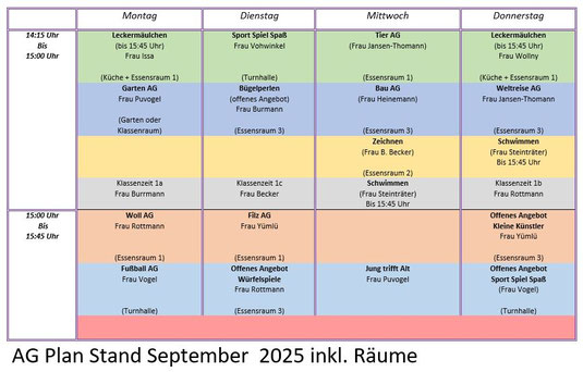 Bitte beachten Sie, dass eine regelmäßige Teilnahme an unserem AG-Angebot verpflichtend ist und eine Abholung während der AG-Zeit nicht möglich ist.